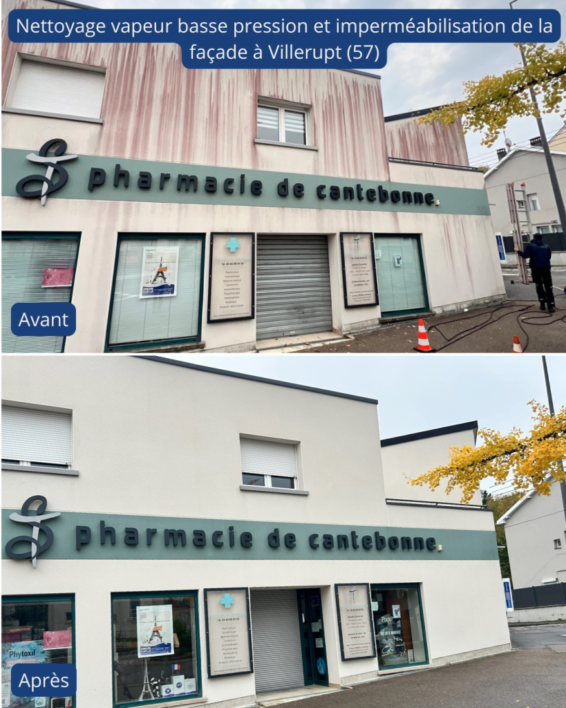 Le gérant de cette pharmacie nous a sollicités pour éliminer les algues rouges incrustées sur la façade.